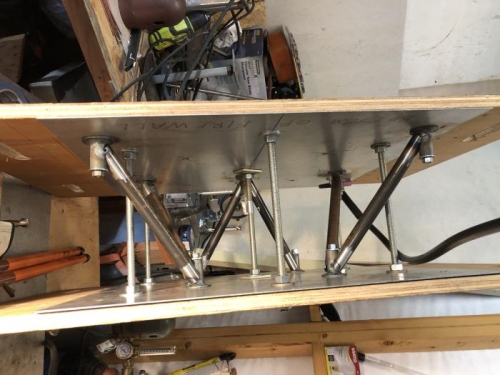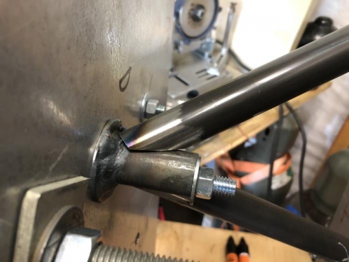 spent the day shaping the ends of the motor mount tubes and tacking them into place. This was the point where motor mount version 1.0 came to grief....I just ran out of patience with the shaping process and began accepting worse and worse fitup, thinking I could bridge the gaps with extra filler metal. That was wrong and I am taking much more time with the shaping process and getting much better fitup as a result. Still not perfect, but much better. I've learned a couple more things, with the most important being take all the time it requires to get it right. another point is to be aware of where the second member is going to land, when a particular standoff has two tubes connecting to it. Ideally each tube would have its own separate landing spot on the standoff. If I do go to a motor mount 3.0, I will seriously consider using standoffs of larger tube diameter than the actual tubes themselves. Another point to consider is that given the access dificulties caused by other tubes and the threaded rod which holds the assembly jig together, it may be better to finish weld some of the inner tubes before attaching the outer tubes. In versions 1.0 and 2.0, I had tack welded all the tubes first and then went in trying to finish weld around all the interferences, which was very difficult.