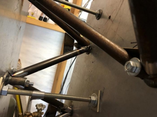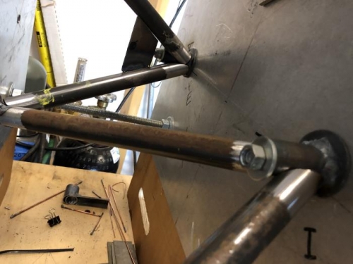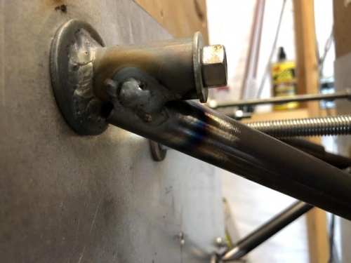 This motor mount fabrication is really starting to get to me. I made the hood and goggles so I can get my head inside the fixture, and that helps, but it also presents the problem that I have to start the arc without being able to see where my tungsten is, so that's a pain. Today I did finish the one full weld I needed to complete so I could put in the last diagonal tube and get that tacked into place. I would like to get a lot more tacks into place before I start removing the threaded rod spacers that are holding my assembly jig together. I want to keep it as rigid as I can for as long as I can, to fight against distortion. But at some point those threaded rods are going to have to go so I can get acccess for welding.