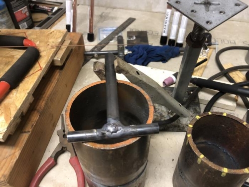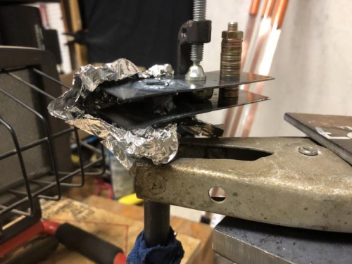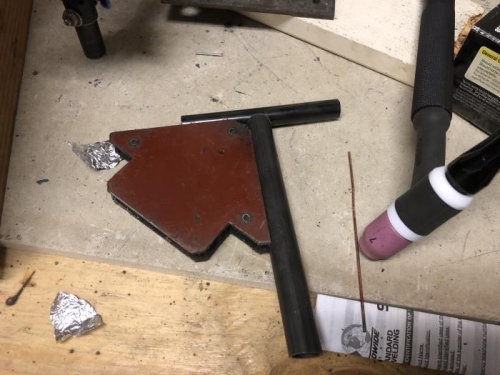 Welding on rudder pedals and belcrank for activation of elevator push-pull rod. The aluminum foil around the belcrank is an argon dam to hold the argon in place around the control rod because I had to extend my tungsten to an excessively long stickout to reach inside for the last weld.