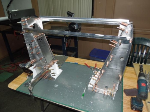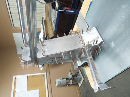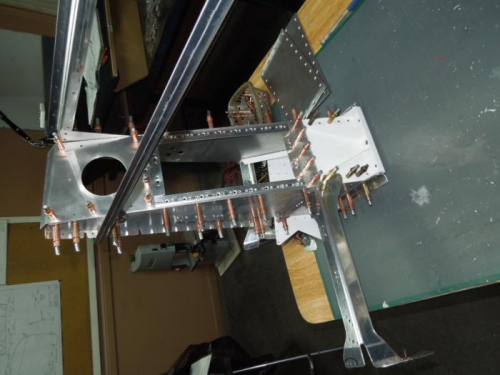 - Joined the two L/G box L/H and R/H together with the cross braces F801T-1 and F802N-1. - Drill full size the matching holes in L/G boxes L/H and R/H with the cross braces F801T-1 and F802N-1 - Disassemble both L/G boxes - Deburred all holes in L/G boxes - Scuffed all parts for L/G towers with 3M Scotch Brite