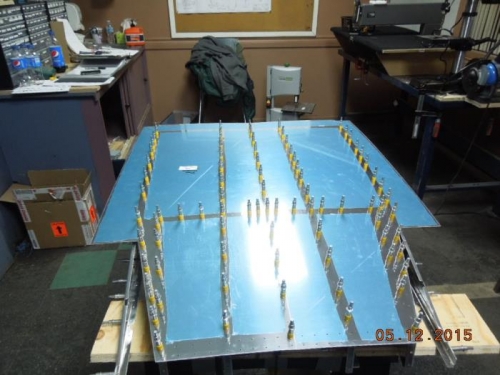 - Re-assemble all the Seat Rib Sub Assy on cleco - Drill the interface with Spar F806 - Removed blue vinyl film along rivet line on skins F826-1 and F827-1, and fluted flange on F827-1 per instructions - Following that, I cleaned the saw horses (they came from outside in the garden) and added carpet on them to prevent part damage - I spend a few minutes to install no marr boots on 100 cleco 3/32 - I located the seat rib sub assembly upside down on the saw horse - Cleco both skins F826 and F827 on the seat rib sub assy. - Later that evening, I match drill skins F826 & F827 with Seat Rib Sub Assy - Removed the skins from the seat rib sub-assy - Deburred all holes in skins and seat rib sub assy