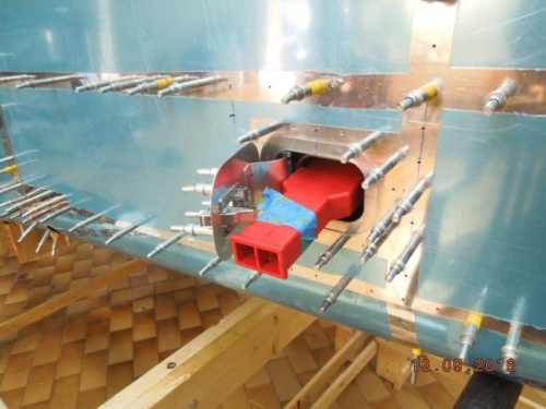 This Tuesday, my objective was to finalize the External Power Plug modification for good ! One last step remaining was match fitting the hatch door with the offset hinge arm. Since I couldn't locate the door if the hinge is located in place with cleco, I had the rivet the hinge to the doubler, then rivet the offset hinge arm as well. Once that was done, I taped the hatch door to the aircraft exterior side skin. From inside the aircraft, I drilled holes from the offset hinge arm into the hatch door.