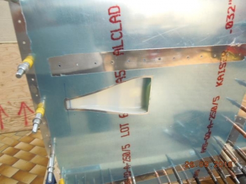 I decided to start fitting the plastic NACA scoop on the interior side of fuselage Skin F820-L-1 right now. I am doing this at this early stage because I've decided to install this scoop not only with sealant used as glue, but also with solid 3/32 countersunk rivets. I want to take the opportunity later to dimple those rivet holes at same time I will be dimpling the skin panel. I will be much easier done this way.