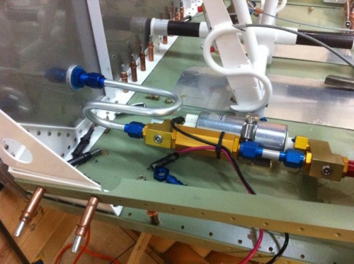 This Sunday afternoon, my objective was to finalize bending all the 3/8" dia fuel line. The last one I had to fabricate was the fuel line between the boost pump and the fitting on the firewall. Since the pump outlet is not in line with the bulkead fitting, and it is so close together, I made severals attemps to either 90 deg or Z bend 3/8" tube to fit in between, with no success. I finally use a "crooked" S shape tube, with double 180 deg bends, to make sure it lines up between the fitting and the pump outlet to engine. Hopefuly, that will not create any fuel restriction the the engine.