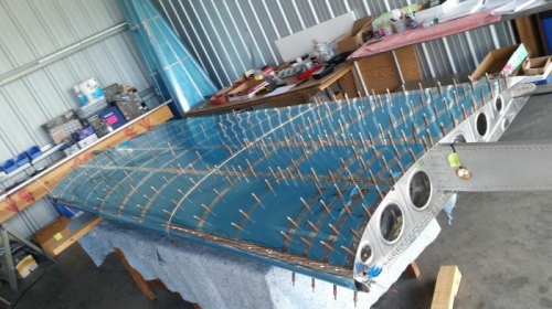 Progress slowed a bit on the right wing, but riveting was finished on the underside, and some work began on the top.