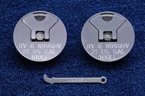 Since the FAA requires that your fuel tanks be labeled with the amount and type of fuel that should be used, the easiest way to handle this is to engrave your fuel caps. I had Bill Esther at "Bill's Custom Engraving" http://www.rvengraving.com/ custom engrave and polish my standard Van's issue fuel caps. They REALLY look cool and Bill turned them around in a week. I highly recommend this service!