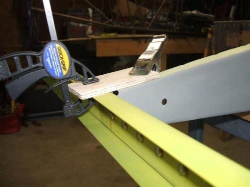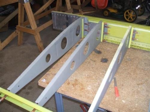 Aft ribs and rear spar attached with clecos to the right wing. Left wing ready for the rear spar attachment.