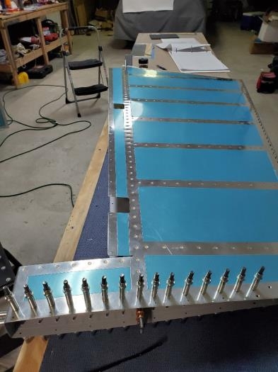 More riveting. Added the counter balance to the counterbalance rib. Had to shave off some of the lead weight towards the front edge so it would fit in between the shop head rivets. Finished riveting the spar to the skin and clecoed the top rib in place and will rivet that tomorrow. I used the numatx squeezer with the 4" yoke for the riveting. Also, final drilled #33 the aft 3 holes to receive the MK-319 rivets.