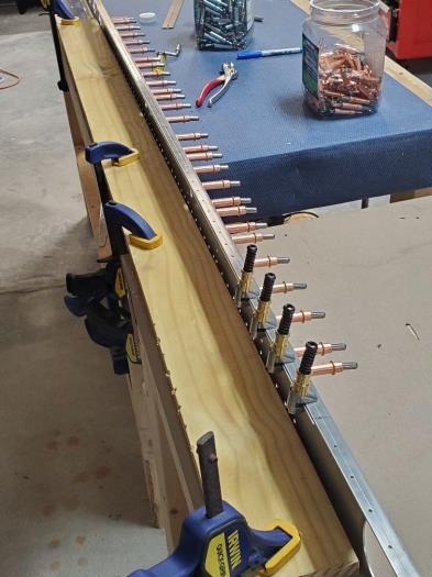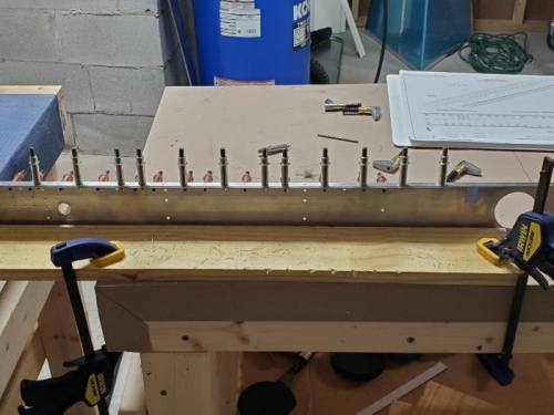 Cut and edge prepped the front spar caps. Match drilled and countersunk many holes as per the instructions. I clamped the spar to the table using a long 1x4 which secured the bottom flange to the table. This allowed a stable platform to match drill and countersink. I used Cleaveland's single flute countersink cutters. They work well as there is no chattering with these tools. I wish these were standard with the -14 tool kit but you have to know to substitute them for the ones they include in the kit.