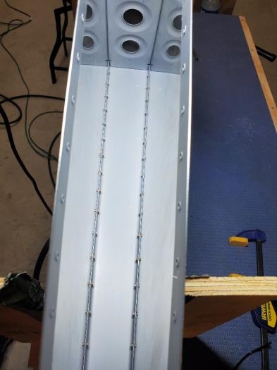 Riveted VS front spar to skin using 3x rivet gun with mushroom head and tungsten bucking bar for the inner spar and ribs. Used Numatx squeezer on most edge pieces and hand squeezer where the Numatx wouldn't fit.