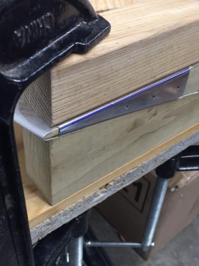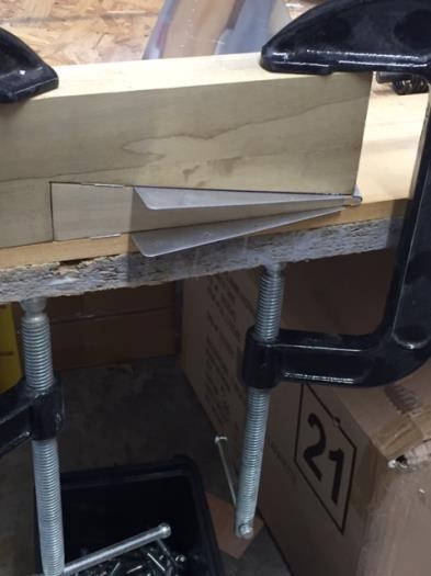 Ok, the third trim tab arrived from Vans and it was finally time to get this done for good. After bending several trim tab practice pieces with consistant 90 deg. bends I felt confident in making the bends on my third trim tab. As before I was able to get a nice ninety degree bend on all four tab ends. I then riveted the trim tab horns, E-717 and E-718 in place with some pro seal smeared between the horns and clamped in place to dry. I feel this has been a great accomplishment and the tab so far has come out better than expected.