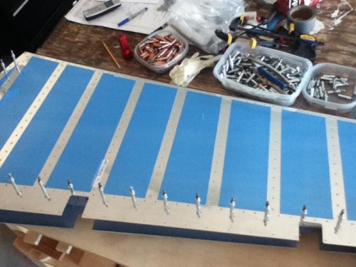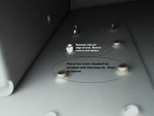 Clecoed skin to spar and beginning with setting rivets on counterbalance skin. Counterbalance skin "under" or "over" rudder skin?? Did Web search - skin goes over counterbalance skin. Plans say to bevel (??) edges of counterbalance skin. Not seeing any difference or bending of rudder skin. No marks or 'line' where two surfaces meet. Double checking when replacing rivets. Put two rivets in before attaching rib - need to remove. One rivet only got edge squeezed by squeezer, bent over, need removal and replacement Setting up and removing rivets took 1.5 hour!