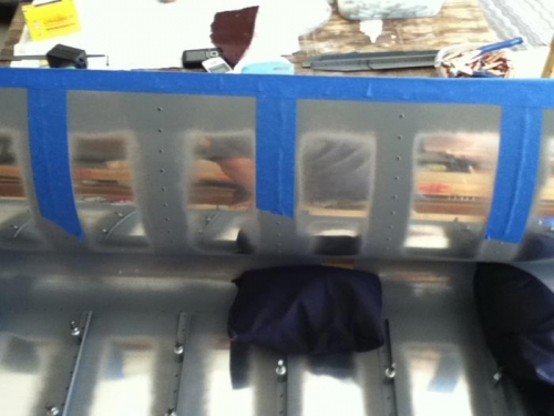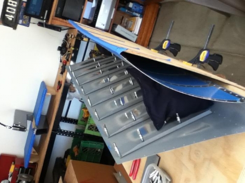 attached piece of plywood to back of table to hold up one side of elevator skin. taped edge of skin to plywood, attached stiffeners to top side of skin. Now rivet tape rivets to outside, pull down and rivet! Riveted 124 flush rivets, back riveting, with no drill outs. Top of right skin done!
