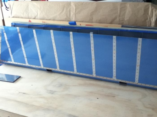 Ready to rivet stiffeners to bottom part of skin. Need to touch up primer on some sanded / scratched areas. Showed up when cleaning / inspecting to get ready to rivet. 104 rivets in, no drill outs!