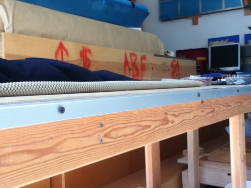 Measured, cut, clamped angle aluminum to work bench flush with table top (as close as I could get) and screwed to table top. Going to double check for "flat". Also received replacement elevator control horn and nut plates.