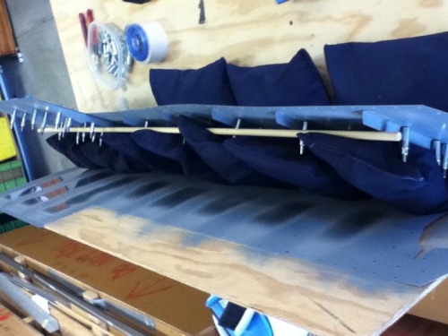 Primed the inside of elevator skin. Started riveting the stiffeners to the elevator top skin. Drilled holes and clecoed the skin to plywood attached to the work table. Using squeezer on end rivets and then switching over to back riveting.