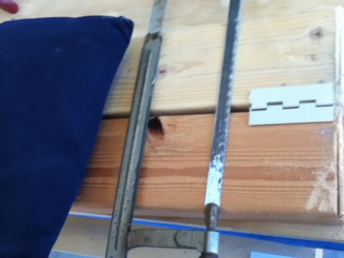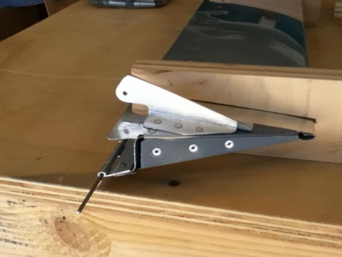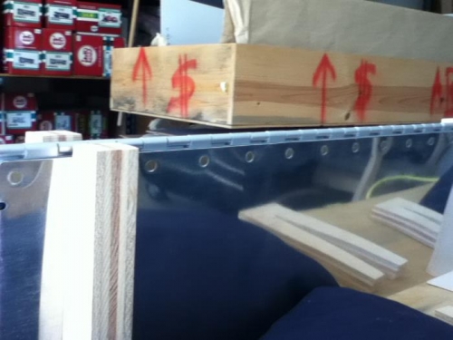 Removed hinge and cut to size. Weighted it down between two 2x4's, hinge loop down and cut with hack saw. Cleaned up with scotch brite wheel. Re-clecoed hinge to trim tab from center out. Slightly better fit of skin to spar, more even. All rivets squeezed. skin a lot smoother. First center rivet needed to be drilled out I used 3-3.5 instead of 3-4 rivet. TOO thin on driven side - would be too weak. New rivet fits a lot better. Pop riveted the end rivets cs-4-4