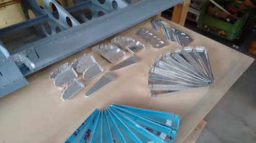 Identified parts needed to assemble / construct flaps. Removed protective plastic, ensured that flanges were 90 degrees, deburred holes and edges, marked parts with correct part numbers.