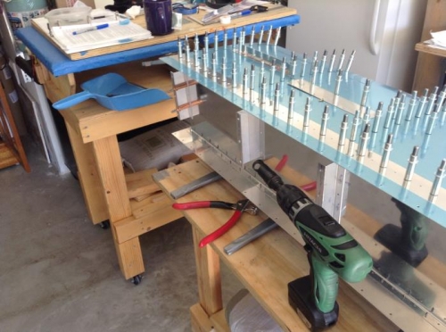 Marked and used solder gun to remove strip of protective plastic. Used a scrap piece set depth of countersink. Counter sunk all 164 holes, checked each hole with rivet to verify depth. All hold just a bit deep to allow for epoxy. Drilled out spar attach screw holes with #19 drill bit.
