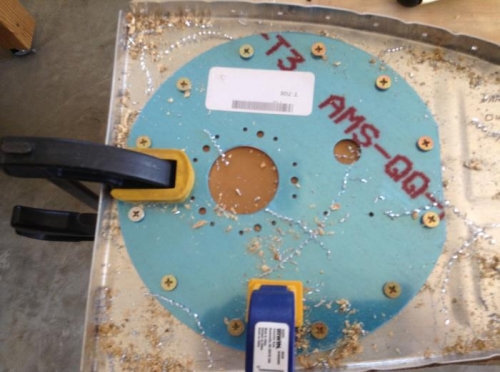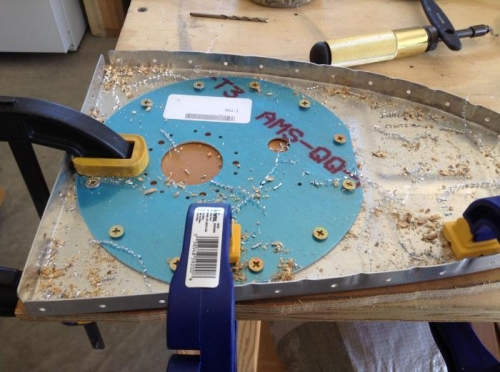 Clamped T-708 access plate to rib, centered over hole drilled in rib, and drilled out #8 screw holes. Needed special sized clecos (3/32 - Black) - ordered 20. Made do with #8 screw and nut plate to hold things steady.