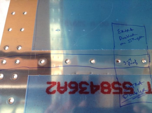 Score and peel plastic off top inner skin, clean up holes and outer edges. Install nut plates on lower inside skin (1 drill out) Dimple doubler and lower inside skin. Un-dimple 7 holes - holes need to be UN dimpled for later install process. Dimple stringer - one hole bunged up by over active / twitchy finger on squeezer. Fabricated doubler (and primed) for messed up hole - just past where stringer overlaps. Marked and will two longer rivets when installing / riveting to skin. same size as used on overlapping stringers to skin. Marked plans and skin holes "3-4 rivets"