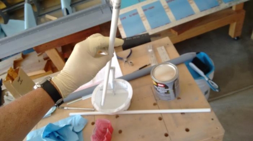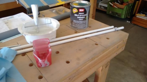 Finished sanding down rod ends. good fit. Primed inside of push rods - made funnel of paper and poured acetone to clean. Dried with compressed air. Used same funnel to pour primer into tube while turning tube. Drying. New method is to spray primer in from both sides per manual / construction documentation.
