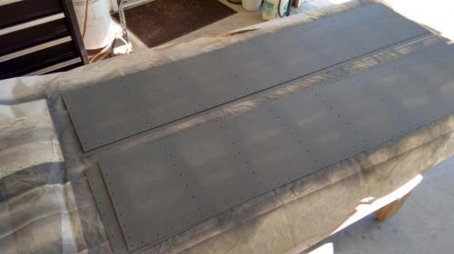 Re checked skin to spar orientation and found two skins upside. RE-RE-CHECKED test fit to spar to verify (again). Drilled right skin stiffeners Pulled blue plastic off inside skin and marked outside strips where rivets will go (soldering iron) Scuffed up inside skins and primed.