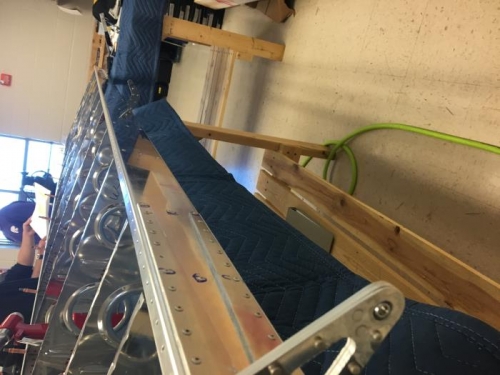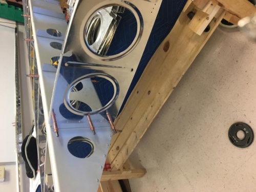 Stacy A, Brian W., and Garret R. match drilled two middle holes on most outboard rib, deburred them. Clecoed rear spar to ribs and riveted them. Debured and started clecoing the main ribs on the right wing.