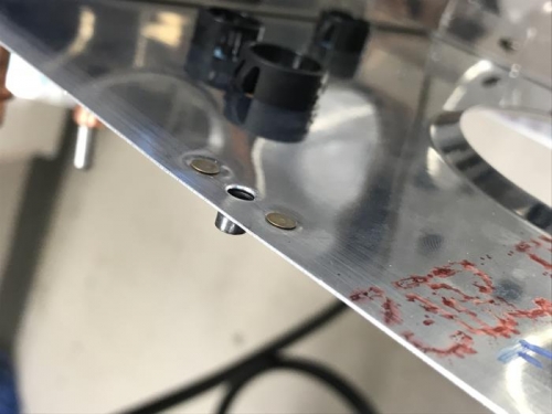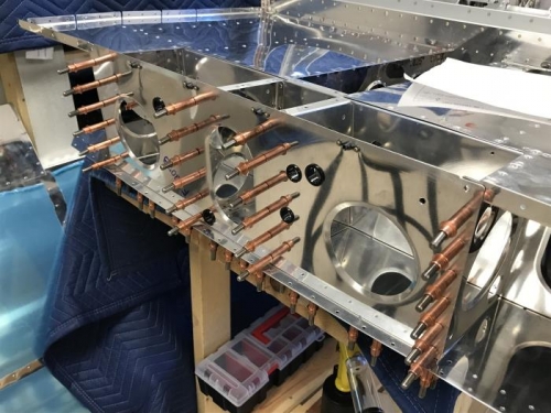 Dimple the four sets of nutplate attach rivet holes in the F-1207B Baggage Bulkhead. Dimple the nutplates, then rivet them to the F-1207B BaggageBulkhead. Cleco F-1207B to the Assembly. Did not rivet yet.