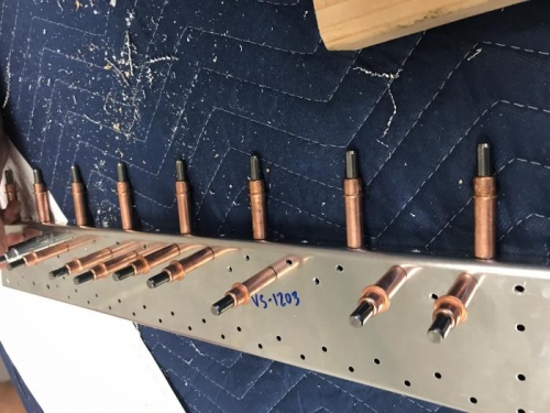 Match-Drill remaining #30 holes to rear spar web into lower spar cap. Match-Drill #30 the VS-1203 Rear spar flange holes into the VS-1212A-R and VS-1212B-R Cleco as I go. Match-Drill #40 nutolate attach rivet holes from the VS-1203 into 1212A-R and 1212B-R. Match-Drill #12 the 3/16 holes of the VS-1203 into VS-1212A-R and 1212B-R. Remove sapr caps, deburr athe holes and clear away any chips.