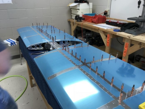 Rivited the bottom skin from left to right. Got half of it rivited. Need to finish on next day. Most of clecos are taken out and replaced with rivits.