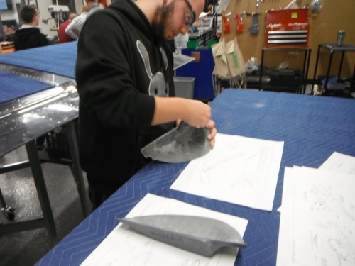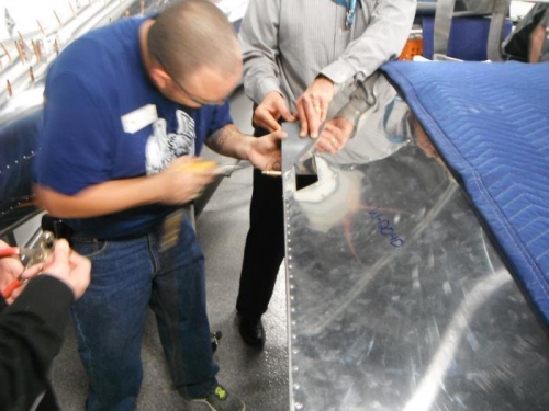 brian sanded part W-1222-R, they drilled out three rivets per side with a #40 bit Pierceton/robbert, used pliers to pull out inner parts of rivets on both wings,match drilled #30 on part W-1204D, clecoed part W-1222-R to wing W-1204D