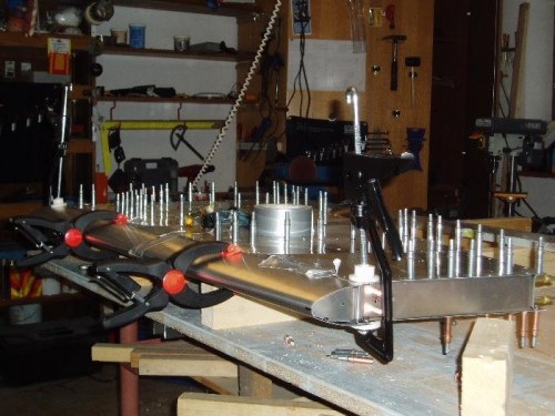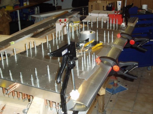 drilled and clecoed leading edge ribs to front spar and leading edge to spar and skins