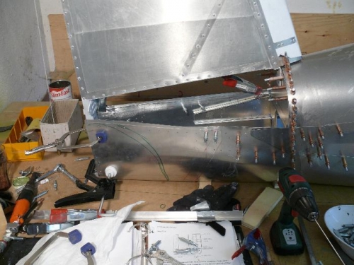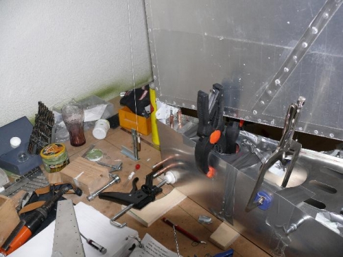 redid fin to tail attachment, used new FUS30 tailwrAP (had two becaus doubler will be fitted over FUS 30 partially, will use missdrilled FUS 30 for doubler mod!. realligned fuselage bolted fin securely down to table, and fitted new FUS 30 used same holes in horiz bh- lots of carefull backdrilling- long night...