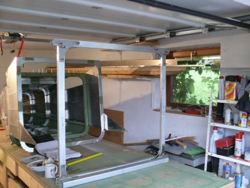 joined cage with tailcone, took me a while to aligne everything, once everything was square and parallel I checked distance btw wing fittings and noticed that my cage is one inch to short !!!!, I clecoed on hole to much btw FUS25 and FUS26. Guess was lucky to catch this in time,,,, had to realigne everything, made stand for end of tailcone