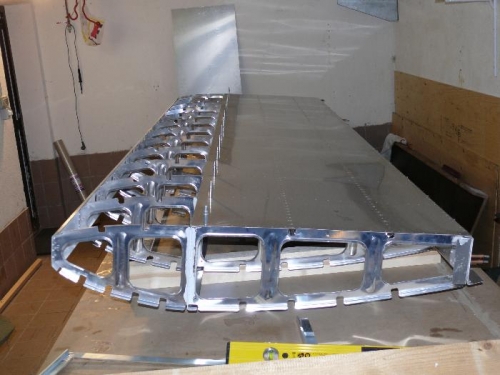 finished riveting of LE stringers, moved wing out of basement into Garage, ckecked if straight and level, placed bottom + tank skin on wing skeleton- ready to drill main ribs!
