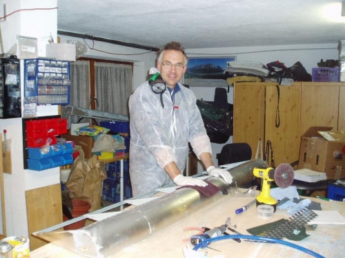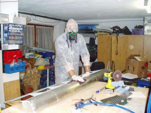 prepared ailerons for priming, drilled rivet holes for fabric rivets in ribs, cleaned and scotch brighted them, started spraying the primer