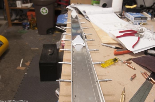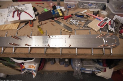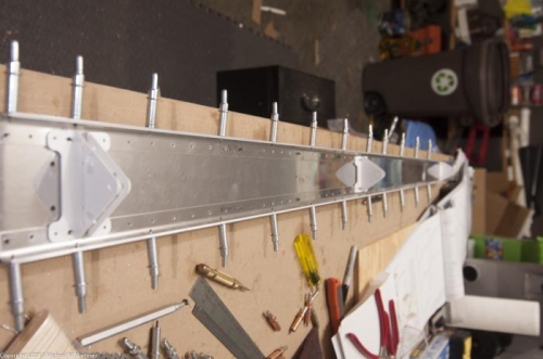 Deburred flange portions of spar caps and rear spar. Deburred spar doubler. Cleco'd upper hinge doubler and hinge to spar, cleco'd middle hinge to spar and spar caps and cleco'd bottom hinge to rear spar, spar caps and doubler plate.