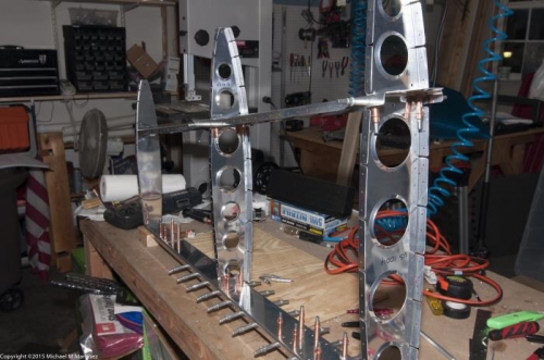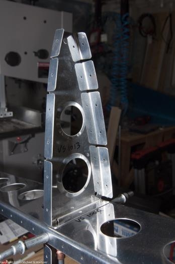 Deburred VS ribs, forward spar and rib noses. Then cleco them together to form the VS skeleton and match drilled the common parts. I used the scotch-brite wheel to shave off the front of the rib noses to make fitting into VS skin better. Still need to check with Vans on VS1005 on whether it's OK with fluting or re-order VS1005 to fix my earlier attempt.
