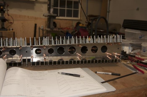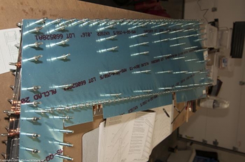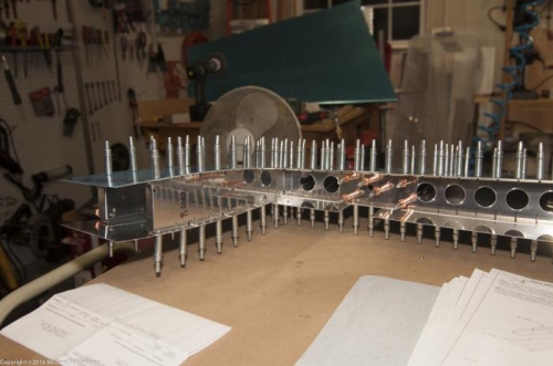 Deburr skins and cleco to the stiffners and rudder spar. In the middle of this, took trailing edge and trimmed it to fit the rudder. Cleco'd every hole in the trailing edge and in the spar. Noticed that the skin doesn't always sit tightly and need to move the complete rudder assembly to get the skin to sit right.