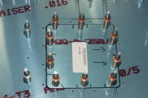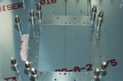 The douber and access plate used are available from Van's as VA-195C and VA-195D, which are the doubler and hatch cover used for the stall warning system on the wings. The forward edge of the doubler is located 3.2" aft of the cutout for the middle rudder hinge, with the top inner edge of the doubler plate aligned with the top part of the middle rudder hinge cutout. Matched drilled the 3/32" rivet holes for the doubler, placing clecos after each hole is drilled. Then matched drilled the 1/8" holes for the access plate screw holes, installing clecos. Then removed the doubler plate and cleco'd the access plate to the rudder skin and draw the outline of the plate.