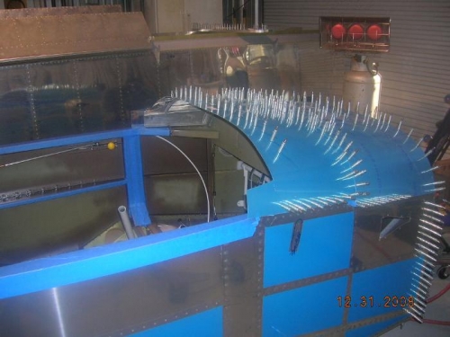 I put the forward skin back on and put the canopy frame back on and with the extra clearance I made in the spacers, I was able to get the gap consistent at 1/32 between the skins. I then massaged the rear of the canopy to fit the fuse better and drilled the C-614 to the frame and clecoed it in. I had to quit for the morning as I'm going to Headland to see Al DeWeese's project this afternoon. He also has a tipper and is farther along than I am so I want to look.