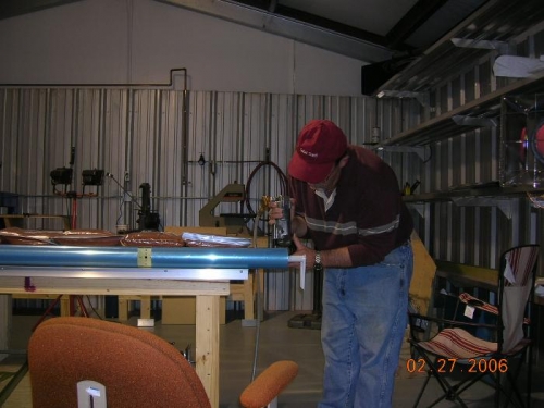 Riveted the bottom skin on the right elevator spar. Used a combination of A426 and pop rivets per the plans. Wish there were some way to use A426's on all of it. They sure look better than the pop rivets. Reva came out to help me when she got home from work. It sure is more fun when she's there. I let her squeeze some rivets on the tip ribs on the right elevator then I completed riveting them. All that's left on the right one is the trailing edge and the tips. We then riveted the stiffners on the top of the left skin and then riveted the spar to the top skin. It was a lot easier this time. I guess practice makes perfect. I've found that the air pressure is really important when shooting rivets. I've erred on the too little side up until tonite. I've found that 40# for A426-3 rivets works the best. Now if I can only remember it. Probably won't do much the rest of the week as I have to travel to New York City on business on Wednesday. I checked the pro number with ABF Freight today and according to them the wings haven't shipped. I'll give them a couple more days, and if they haven't shipped by then, I'll send an e-mail. I was billed for them almost 2 weeks ago.