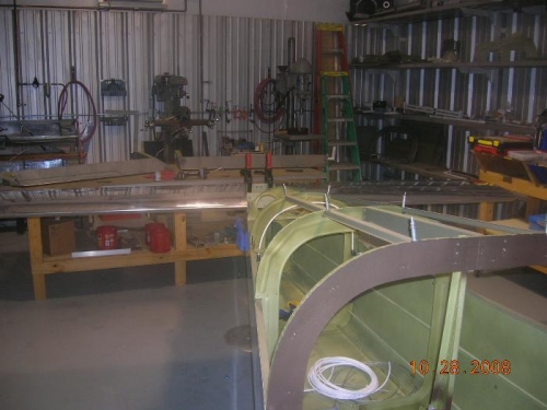 After measuring again, and being satisfied with the measurments, I drilled the holes into the aft deck. Before drilling I checked to see that there would be suffiecient edge distance and drilled. I put temp bolts in the holes checked to see that it was level with the carry through spar. I figured that was a better place to measure than the aft deck in case there was any twist in the fuselage. There was a very small twist, which took a .025 shim under the left bracket to make it perfect.