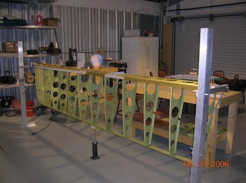 Tonite the goal was to get the left wing on the wing stand. I spent about 45 minutes mounting the aluminum stands to the floor and making a 5" piece of angle to hold the outboard end of the wing.Jim came over and helped me set it in the stand and clamp/bolt it solidly. Then we stretched a piece of fishing line accross the bottom set of holes in the front spar and raised the middle accordingly. It really looks good. I have to get a couple of plumb bobs tomorrow and see where it's at for twist. I'm trying to figure out a way to clamp the rear spar and not be in the way of the skins.I moved the right wing on the big table and cleocoed main ribs into it. As you can see in the third photo, I laid the plans out on the table this time and didn't have to move any around when I got done. I have to drill out some more holes for pitot lines and match drill the front holes before I can go any further.I probably won't get to work on it again till the weekend.