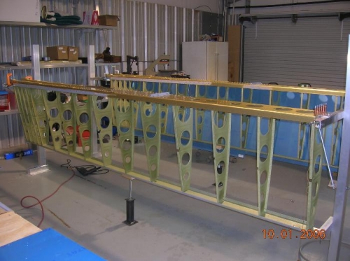 This evening I used the water trick with the plumb bobs to great success. They are less than 1/32 off from end to end. Then I located the sheet of aluminum for the wing walk doubler and drilled it per the instructions, using the inner top wing skin for a pattern. Just before quitting for the evening, I clecoed the top skin on the left wing. I also marked 2 pieces of 1/2" plywood for the nose rib cut out and gave them to Jim to cut them out, since he had my jig saw.