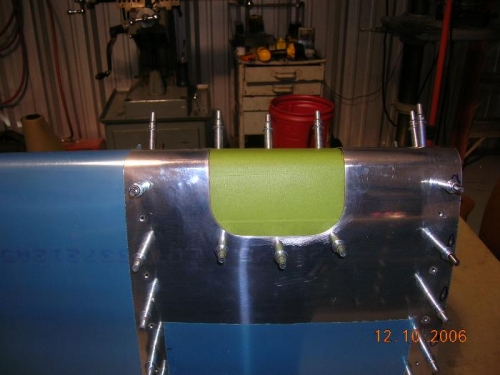 Tonite I put a carbide burr in my die grinder and made short work of cleaning up the hole to the lines. I now have nice straight edges and smooth radii in the corners. I progressed with some small sanding drums in my dremel and then some hand sanding and I believe the holes are good. Following the directions I drilled the skin and shaped the plexiglass. As you can see from the picture, I covered the lens with some painters tape to avoid scratching it.