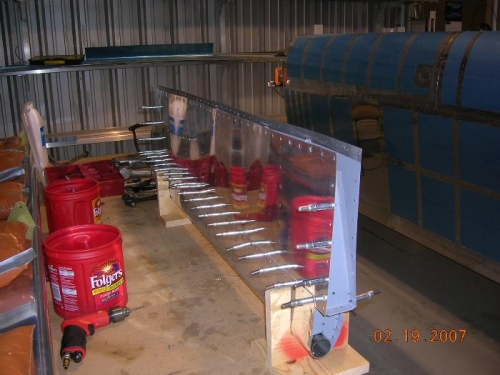 I put in a good day today and got alot accomplished while celebrating President's Day. I finished riveting the right flap and put in on the "flat" table and epoxied the trailing edge. It will stay that way until tomorrow evening. Then I squeezed the rivets on the trailing edge of the left aileron. I used the special sets I ground when I did the rudder and used the hand squeezer. This is my first trailing edge using epoxy instead of proseal and I'm pretty happy with it. It's not as big of mess as proseal and it seems to work equally as well. The left flap is complete now and is VERY straight. I can't see any waves or bows in it. I then riveted the left aileron together and as soon as the right flap comes off the table tomorrow, I'll epoxy the trailing edge on this aileron. I have to open the boxes that the fuselage came in to, not only invetory, but to get the right top aileron skin out of it so I can finish.