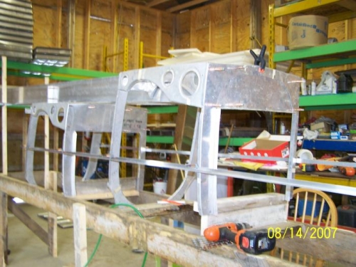 This is the beginning of the "MASSIVE" level of modification from a RV-3 into what we are now calling the Hurricane. The use of two parallel pieces of 1/4" X 6" aluminum running fore to aft through the fuselage bottom, dubbed the " tunnel ", is how we created the height difference between the front and back seats. The front seat pans are actually cut into the tunnel while the original RV-3 seat pan and wing center section are attached directly on top of the tunnel. We are hoping that this difference in height gives better visability from the rear seat. The tunnel also serves as a great area to run push/pull tubes for the controls.
