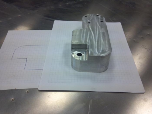It took two different days of measuring and machining to come up with this axel attach fitting for the landing gear. The strut attaches through the vertical hole and the axel bolts to the round 4 bolt pattern. Tim is bringing the measurements and tracings of the part home to input them into Alibre. The next fitting should only take a couple of hours to machine.